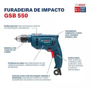 Produto Furadeira de ImpactoMarca BoschUso Indicado Para madeira, metal, concreto e plásticoModelo GSB 550 REPossui Impacto Com ImpactoImpacto 49600 ipmImpacto Baixo 3100 ipmImpacto Alto 49600 ipmMandril 1/2 "Capacidade do Mandril 13,00 mmAcompanha Fio SimComprimento do Fio 2,00 mAlimentação ElétricaFerramenta de Uso e Operação FuradeiraTensão Elétrica 127V (110V)Potência 550 WVelocidade 3100 rpmCapacidade de Perfuração da Alvenaria 13,00 mmCapacidade de Perfuração da Madeira 25,00 mmCapacidade de Perfuração do Metal 10,00 mmCapacidade de Perfuração do Concreto 13,00 mmCapacidade Máxima de Perfuração 25,00 mmProduto Acompanha Embalagem SimTipo de Embalagem CaixaAltura da Embalagem 290,00 mmLargura da Embalagem 243,00 mmProfundidade da Embalagem 83,00 mmPeso do Produto na Embalagem 2,37 KgConteúdo da Embalagem 1 Furadeira de Impacto, 1 Chave de Mandril, 34 AcessóriosDimensão da Embalagem 290x243x83 mmPeso do Produto 1,70 KgAcompanha Maleta NãoFerramenta Intercambiável NãoCor AzulDica Você pode utilizar vários tipos de brocas com esse produto. Desde as brocas de 1mm à 13mm às brocas de perfuração de madeira, metal, concreto e plástico. Lembre-se: ao usar qualquer ferramenta elétrica, use equipamentos de segurança, como luvas e óculos de segurança.Aviso Utilizar EPIs durante manuseio da ferramnetaGarantia do Fabricante 12 mes(es)