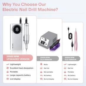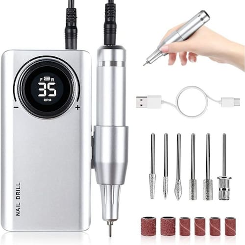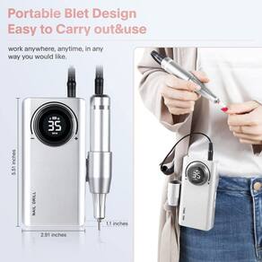 Furadeira de unhas recarregável de 35.000 rpm Por que você escolhe a furadeira elétrica Create beauty life? 1. Esta furadeira de pregos aprovada pela CE tem extensão ajustável de alta velocidade, de 0 a 35.000 rpm, boa para usuários iniciantes e avançados. É funcional, silencioso e fácil de usar, ótimo tanto para técnicos profissionais de unhas quanto para uso doméstico pessoal. 3. Bateria grande de 2600 mAh, recarga total de 2 horas, tempo de trabalho: 8-10 horas. 4. Tem rotação bidirecional para frente e para trás e é adequado para manicures da mão esquerda e da mão direita. 5. Essas brocas de unhas vêm com um kit de cabeças de polimento para serem substituídas confortavelmente. Proporciona uma experiência tranquila e agradável de manicure e pedicure.\ nInstruções para o método de instalação da máquina de polir:\ n1. Segurando o corpo com a mão esquerda, use o polegar direito e o dedo indicador para girar o botão até que o clipe 2. seja solto. Depois que o acessório for solto, a cabeça de moagem pode ser retirada diretamente da máquina autêntico. 3. Substitua a broca de polimento, mude para a broca de polimento que você precisa usar e insira-a completamente. Gire o botão para a direita para travar a broca de polimento e ela estará pronta para uso.\ nPrecauções\ nDica da agulha: para polir as unhas cortadas, o polimento curvo é mais macio e suave. Lixe as protuberâncias das unhas, remova a cola das bordas das unhas, etc. Cabeça cônica: usada para polir a superfície das unhas, realçar e polir os cantos das unhas, etc. Bunda pequena: polir as raízes das unhas pequenas, remover calos, esfoliar, remover unhas, etc. Bunda grande: polir as raízes de unhas grandes, usadas para remover calos, esfoliar, remover unhas, etc. Cabeça do eixo com anel de areia - você precisa instalar o anel de areia antes de usar o eixo removível. Os grãos de areia no anel, como a onicomicose, variam em tamanho e intensidade.