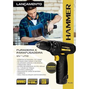A furadeira e parafusadeira PLI10 Hammer 12V Bivolt é leve, versátil e possui um cabo ergonômico/anatômico para melhor empunhadura. Seu formato é ideal para alcançar cantos menores.