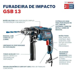 Furadeira impacto 650w gsb 13 re bosch + acess gsb13re Voltagem: 110v Furadeira de impacto e parafusadeira bosch gsb 13 re profissional + maleta de transporte e kit x-line 30 peças