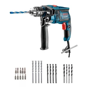 - Furadeira de Impacto Profissional Bosch GSB 13 RE 750W em caixa de Papelão; - 01 Bolsa Organizadora com 23 Acessórios sendo: - 10 Pontas para aparafusar; - 04 Brocas para Concreto 4 mm, 5 mm, 6 mm e 8 mm; - 04 Brocas para Madeira 4 mm, 5 mm, 6 mm e 8 mm; - 04 Brocas para Metal 4 mm, 5 mm, 6 mm e 8 mm; - 01 Extensor Universal: - 01 Chave para Mandril; - 01 empunhadeira emborrachada; - 01 Limitador de Profundidade; - 01 Manual de Instrução; Não acompanha Maleta para Transporte