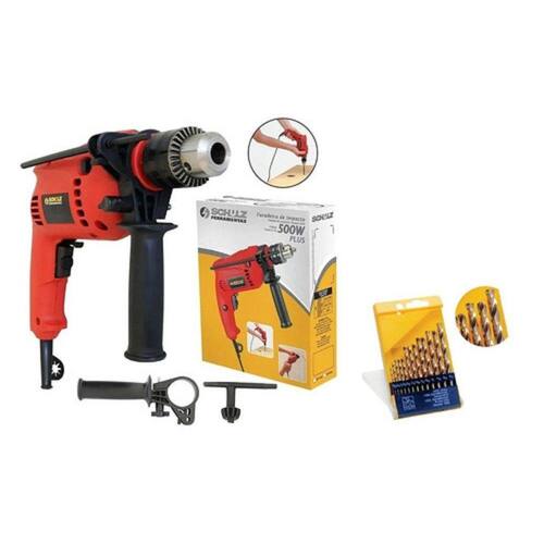 Furadeira Parafusadeira Imp 500w Vel Variável 1/2 SchulzJogo De Brocas Em Aço Rápido Com 13 Peças 4667 TitaniumCaracterísticas- A Furadeira de Impacto 500W Plus é uma ferramenta leve e prática.- Com função de impacto e guia de profundidade, auxilia no dia a dia das pessoas que buscam realizar as tarefas de manutenção de casa com comodidade e rapidez.- Seu punho lateral com rotação 360° garante mais conforto e precisão nas atividades manuais.- A furadeira ainda conta com controle de velocidade reversível e botão trava gatilho para serviços de perfuração de madeiras, metais e concreto.Aplicação- Esta ferramenta foi desenvolvida para uso doméstico ou hobby.- Indicada na furação de alvenaria e pedras (quando possuir opção ”furação com impacto” metais, madeira e plásticos, além de poder ser utilizada para trabalhosleves de remoção de parafusosPrincipais componentes e suas funções- Mandril: função de fixação de brocas, bits e acessórios;- Punho lateral: serve para aumentar o controle sobre a ferramenta e reduzir riscos;- Comutador “furação rotativa/furação com impacto”: seleção do modelo de furação;- Alavanca de seleção do sentido de giro: seleção do sentido de giro do mandril;- Trava gatilho: quando acionado, mantem a ferramenta funcionando por tempo indeterminado,para soltar pressione o gatilho liga/desliga;- Botão liga / desliga - Controle de velocidade: serve para ligar (pressionado) ou desligar (solto)a furadeira, ajuste gradativo de velocidade;- Chave mandril: serve para fechar ou abrir o mandril para a inclusão ou troca de brocas e acessórios;- Guia de profundidade: serve para verificar a profundidade da perfuração.Especificações- Marca Schulz- Modelo 110v (929.0040-0) 220v (929.0041-0)- Tensão 110v ou 200v- Mandril 13mm- RPM 2800- Potência 500w- Peso 1,5- Capacidade máxima de furaçãoAço 10mmConcreto 13mmMadeira 25mmItens Inclusos- Punho Lateral- Guia de profundidade- Manual de instruções+ Jogo De Brocas Em Aço Rápido Com 13 Peças 4667 Titanium- Utilizadas em trabalhos de perfuração, são brocas helicoidais com haste cilíndrica, resistentes e duráveis na perfuração.- Embalagem prática e resistente que proporciona facilidade de organização das brocas com indicação do diâmetro dentro do estojo.ESPECIFICAÇÕES:- Marca: Titanium- Ref.: 4667- Quantidade: 13 Peças-Indicadas para furação em metais- Brocas fabricadas em aço de altíssimo desempenho- Garantia: 3 mesesITENS QUE ACOMPANHAM:- 13 brocas:5/64”7/64”1/8”9/64”5/32”3/16”13/64”7/32”15/64”1/4”17/64”9/32”5/16”*IMAGENS MERAMENTES ILUSTRATIVAS*
