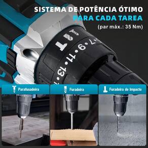 Potência Imbatível: 35nm de torque e 18 níveis de ajuste para perfurar aço 10mm e madeira 25mm com facilidade, além da função impacto para concreto. Trabalhe Sem Parar: Duas baterias de 2000mAh garantem autonomia prolongada, com indicador de carga para você nunca ser pego de surpresa. Conforto e Visibilidade: Empunhadura ergonômica Soft Grip e luz LED integrada para trabalhos precisos mesmo em locais com pouca iluminação. Pronta para Ir Onde Você For: Design compacto, leve apenas 1,190kg com bateria e maleta resistente para transporte e organização fáceis. Kit Completo de Alta Performance: Acompanha 9 brocas, 6 bits, extensor flexível, jogo de soquetes e conectores, tudo para otimizar seu tempo.