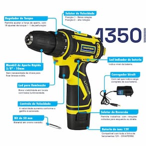 Furadeira Parafusadeira Chiaperini 1350 3/8 A Bateria 12V 1.3amp Carregador Bivolt Parafusadeira / Furadeira a bateria 1350 – 12VParafusadeira/Furadeira a Bateria 12V – a solução ideal para suas tarefas de montagem e perfuração! Com controle de velocidade ajustável, para maior precisão em seus trabalhos. A funcionalidade de rotação reversível facilita o aperto e desaperto de parafusos. Acompanha um bit de 50 mm para várias aplicações, carregador bivolt para praticidade, luz de LED para melhor iluminação e mandril de 3/8?.Com a maleta organizadora inclusa, tenha tudo ao alcance das mãos.Aproveite a versatilidade, eficiência e praticidade dessa ferramenta para otimizar suas atividades!Indicada para qualquer tipo de manutenção ou reparo em casa, marcenaria e indústria de acordo com as suas característica técnicas. Tensão: 12VBateria: 1300 mAhRotação: 0-350 / 0-1350 rpmRegulagem de Torque: 18+1Torque 22NmMandril: 3/8" (10 mm)Peso: 0,9 kgPeso com Embalagem: 1,4 kgDimensões: 260 x 240 x 70 mm Acompanha o Produto:– 1 Bit de 50 mm– Maleta organizadora– Carregador Bivolt– Manual de Instruções – Garantia legal de 3 meses contra defeito de fabricação* Ean: 7890534273697