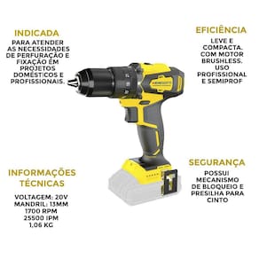 Furadeira parafusadeira mfi-20 20v menegotti + kit broca bit Furadeira de impacto e parafusadeira a bateria 20v intercambiável mfi-20v com motor brushless menegotti + baterias, carregador e jogo de brocas e bits Os modelos intercambiáveis da menegotti chegaram, trazendo muitas novidades. São ferramentas incríveis, com design exclusivo e tecnologia de última geração. As ferramentas intercambiáveis da menegotti contam com o motor brushless, aquele que não possui escova e possui baixo custo de manutenção. O que é intercambiável É a tecnologia que proporciona a troca de ferramentas, utilizando a mesma bateria. A furadeira e parafusadeira 20v com bateria intercambiável é uma ferramenta versátil e eficiente, projetada para atender às necessidades de perfuração e Fixação em projetos domésticos e profissionais. Com seu motor potente de 20v e bateria intercambiável, essa ferramenta oferece desempenho excepcional e Liberdade de movimento sem a restrição de cabos. Principais características: Cabo com revestimento emborrachado. Motor brushless, sem escova de carvão. Uso semiprofissional, . 3 modos de uso: furar, parafusar e martelete. Dados técnicos: Bateria intercambiável: 20v - lítio - bivolt; Possui led: sim; Torque máximo: 45 n.M; Mandril de encaixe: 1/2; Velocidade mecânica: 0-1700 rpm; Taxa de impacto: 0 - 25500 ipm; Peso: 1,06kg; Motor: brushless; Posição de torque: 21+3; Dimensões c x l x a : : 6 meses; Capacidade de perfuração: Madeira: 20mm; Aço: 13mm; Concreto: 13mm. Itens que acompanham a máquina: - 01 presilha para cinto; - 02 baterias 20v de 2,0ah; - 01 carregador; - 01 jogo de ferramentas de 125 peças wesco. Kit de brocas e bits para furar e parafusar com 125pçs wesco Referencia: ws9958 Kit com: 11 brocas hss 1.5, 2.0, 2.5, 3.0, 3.5, 4.0, 4.5, 5.0, 5.5, 6.0, 6.5mm 5 brocas para madeira 4.0, 5.0, 6.0, 8.0, 10mm 6 brocas para alvenaria 4.0, 5.0, 6.0, 7.0, 8.0, 10mm 4 brocas chatas para madeira 13, 16, 19, 22mm 12 bit fenda 25mm 3mm x2, 4mm x2, 5mm x2, 6mm x 2, 6.5mm x 2, 7mm x 2 8 bit torx 25mm t10, t15, t20, t25, t27, t30, t35, t40 8 bit phillips 25mm ph0 x2, ph1 x2, ph2 x2, ph3 x2 8 bit pozidriv 25mm pz0 x2, pz1 x2, pz2 x2, pz3 x2 14 bit allen/hexagonal 25mm h1.5 x2, h2 x2, h2.5 x2, h3 x2, h4 x2, h5 x2, h6 x2 3 bit fenda 50mm 4,5 e 6mm 3 bit phillips 50mm ph1, ph2 e ph3 3 bit pozidriv pz1, pz2 e pz3 1 escariador 5 soquete 6, 7, 8, 9 e10mm 2 screw finder/localizador de parafuso 1 prolongador