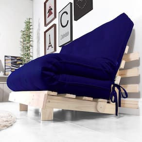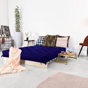 Colchão futon casalEnchimento de mantas de algodão natural e manta de fibra siliconadaEstrutura de espuma ortopédica D28Amarras nas extremidadesBase de madeira maciça