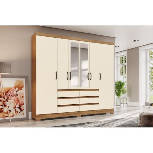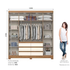 GUARDA-ROUPA B355 06 PORTAS E 06 GAVETAS DIFERENCIAIS Cabideiro de madeira revestido Gavetas com corrediças metálicas Puxadores em ABS bronze TAMANHO A: 2150 X L: 1995 X P: 460 MM Grantia: 90 dias. Montagem: Montagem, desmontagem e outras instalações serão de responsabilidade do cliente. Não nos responsabilizamos, no ato da entrega, por subir escadas/elevadores ou pelo transporte por guincho em apartamentos. Eventuais despesas são de responsabilidade do comprador; Observações importantes: A tonalidade da cor do produto pode variar de acordo com a sua tela, a iluminação do ambiente ou sua percepção visual. Lembrando que são fotos ilustrativas tratadas em estúdios podendo haver pequena diferença nas cores. A montagem será de responsabilidade do comprador; Não nos responsabilizamos, no ato da entrega, por subir escadas/elevadores ou transporte por guincho em apartamentos. Eventuais despesas são de responsabilidade do comprador; Confira as dimensões deste produto e certifique-se de que passará normalmente por supostos elevadores, portas, escadas e/ou corredores de sua residência; Para mais informações, acesse nossa Central de Atendimento. Marca: LM DECOR