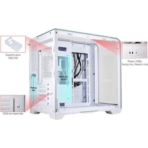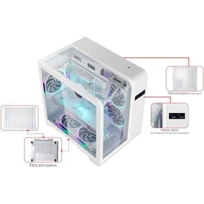 Gab aquario top vidro cyberpunk white w8ki c/display digital - Gabinete gamer cyberpunk white m.Atx - cg-w8ki Painel, parte superior e vidro lateral temperado 4mm Filtro anti-poeira inferior de encaixe modelo gaveta Hd áudio Manual de instrução Botão power, led, e reset Com display digital Gabinete gamer cyberpunk white m.Atx - cg-w8ki Especificações técnicas: Placa-mãe compatível: micro atx e itx Dimensões do chassi : aLP 365x270x370mm Dimensões do gabinete: aLP 380x280x375mm Altura da cpu cooler: até 157mm Placa de vídeo: até 280mm Slots de expansão: 04 Fontes de alimentação compatíveis: padrão atx Portas usb: 1 usb2.0 + 1 usb3.2gen1 typea Baias internas: 13.5+2x2.5 ou 32.5 Chassi 0,5mm Refrigeração: Traseira: 1 fan 120x120mm Vertical: 2 fans 120x120mm Inferior: 2 fans 120x120mm Compatível com water cooler de 120mm traseiro, 240mm inferior/interna vertical fans opcionais não acompanham o produto, devem ser adquiridos separadamente Embalagem: Dimensões cxlxa : 445x345x460mm Quantidade: 01 peça por caixa Peso líquido: 5,2kg Peso bruto: 6,5kg Características gerais do produto: Material: metal vidro : 90 Marca: Não Informado