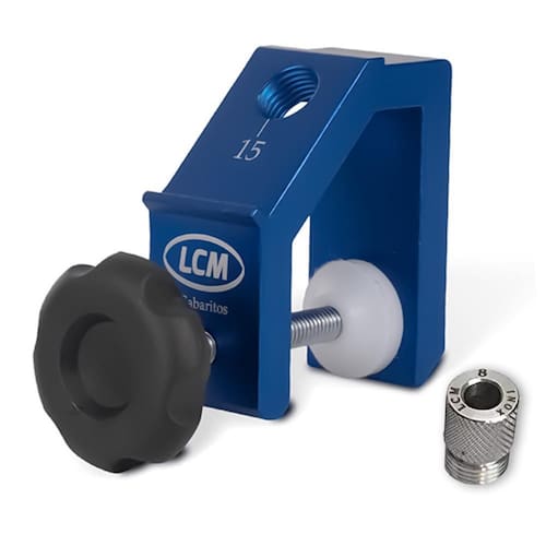 Gabarito Mini Jig Cavilhas 45 Graus 8mm para Chapas 15mm CV45G-15 LCM Gabarito Mini Jig 8mm para Madeira 15mm 45 Graus CV45G-15 LCM. Para gabaritar cavilhas em peças com cortes idênticos de 45 graus, dispensando o uso de fita de borda - Marca: LCM - Referência: CV45G-15 - Gabarito ideal para efetuar as marcações de furação para montagem de moveis planejados, utilizando o dispositivo cavilha para recortes de peças de mesma espessuras em corte de 45 graus - Para madeiras e chapas com espessura de 15mm - Com este gabarito e possível fazer o encaixe e travamento de cantos com o uso de cavilha em peças com cortes idênticos de 45 graus, dispensando o uso de fita de borda - A LCM oferece um gabarito de 45graus completo, diferenciado e de alto padrão em qualidade e acabamento, um produto que busca inovar e sanar necessidades de profissionais e hobbystas. - Fabricado no Brasil - Peso: 205g - : 90 dias Itens inclusos: - 1 Bloco em alumínio anodizado - 1 Manipulo para fixação - 1 Bucha de inox recartilhada de 8mm Marca: Não Informado