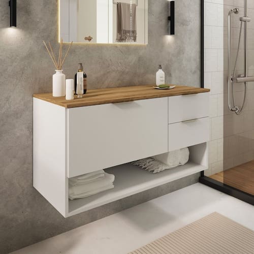 O gabinete de banheiro Ba307 é ideal para você organizar e armazenar itens de higiene pessoal, toalhas e outros produtos. Funcional e decorativo, ele contribui para a organização do ambiente, a estética do banheiro e a praticidade do dia a dia. Não acompanha cuba. Acabamento da Gaveta: Finish Foil Acabamento da Porta: Finish Foil Acabamento da Prateleira: Finish Foil Acompanha Cuba: Não Acompanha Manual de Instalação: Sim Acompanha Parafusos Para Fixação Na Parede: Sim Ambiente Principal: Banheiro codigo_ean: 7900288160980 Complexidade da Montagem: Média: pode ser montado por mais de uma pessoa e/ou necessite de maior conhecimento para montagem Comprimento da Prateleira: 57,3 cm Cor: Branco/Mel Cor da Porta: Branco Cor do Produto: Branco/Mel Cor Flex: Não Cor Interna: Branco Escala de Brilho: Fosco Escala de Brilho da Gaveta: Fosco Escala de Brilho da Porta: Fosco Escala de Brilho da Prateleira: Fosco Espessura da Prateleira: 1,5 cm Furação para Cuba e Torneira: Não Gaveta com Chave: Não Itens Inclusos: 1 Gabinete e Manual de Montagem Linha ou Coleção: BA307 Manual de Montagem e Instalação: https://product-hub-prd.madeiramadeira.com.br/473680655/documents/172f6562-2642-4523-a120-58742f63149c2960993522517484776106411.pdf Marca: DJD Móveis Material da Gaveta: MDP Material da Porta: MDP Material da Prateleira: MDP Material do Puxador da Gaveta: Plástico Material do Puxador da Porta: Plástico Material do Tampo: MDP Material Principal: MDP Montagem Flex: Não Necessita Montagem: Sim Origem do Produto: Nacional Peso: 22 kg Peso Máximo por Gaveta: 5 kg Peso Máximo por Prateleira: 5 kg Possui Espelhos: Não Possui Nichos: 01 Possui Pés: Suspenso Possui Portas: Sim Possui Prateleiras: Sim Possui Recorte No Tampo Para Cuba: Não Possui Recorte No Tampo Para Misturador: Não Possui Sifão: Não Possui Tampo: Sim Possui Tampo de Vidro: Não Produto Montado: Não Quantidade de Gavetas: 02 Recomendações de Uso, Manutenção e Limpeza: Pano seco ou levemento umedecido com água Resistente à Chuva: Não Sapatas Niveladoras: Não Sistema de Montagem: Parafusos, cavilhas e minifix Suporta Até (kg): 20 kg Tamanho do Gabinete: Grande: Acima de 80cm de largura Tamanho Indicado Para Cuba: 34cm x 33,5cm Tipo de Corrediça da Gaveta: Metálica Simples Tipo de Dobradiça/Corrediça da Porta: Metálica Tipo de Gabinete: Gabinete Suspenso Tipo de Móvel para Banheiro: Gabinete Tipo de Móvel para o Banheiro: Gabinete de Banheiro Tipo de Porta: Basculante Tipo de Puxador da Gaveta: Externo Tipo de Puxador da Porta: Externo