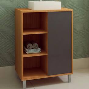 Características adicionais: Acompanha cuba em mármore sintético, 1 porta de correr, 5 nichos, pés em ABS reguláveis.