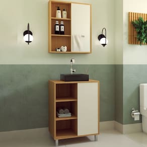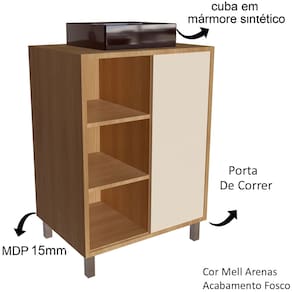 Características adicionais: Porta de correr com espelho, 6 nichos porta objetos; cuba em mármore sintético; gabinete conta com 1 porta de correr, 5 nichos, pés em ABS reguláveis.