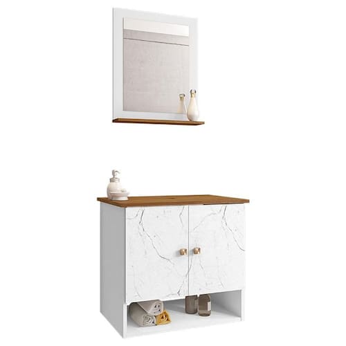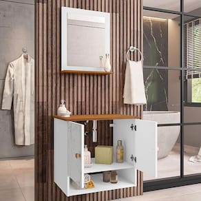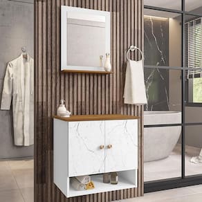 Material da espelheira: MDP de 12 mm no painel e 15 mm na prateleira com espelho de 03 mm de espessura;