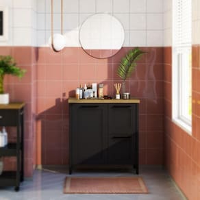 O gabinete de banheiro possui um tampo resistente e durável, ideal para apoiar seus itens essenciais de banheiro. Sua superfície é fácil de limpar, mantendo seu banheiro sempre impecável.