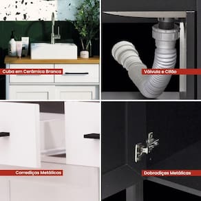 Com duas gavetas e duas portas, você terá espaço suficiente para armazenar todas as suas necessidades de higiene pessoal, como toalhas, produtos de limpeza e cosméticos. A cuba sobreposta proporciona um toque de elegância e sofisticação para o seu banheiro.