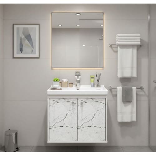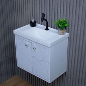 O Gabinete suspenso para banheiro é desenvolvido com estrutura em MDF e o lavatório em BMC, garantindo mais durabilidade e resistência ao produto.