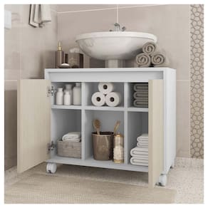 O Gabinete Armario Clean se adapta a sua necessidade, seu design permite que o gabinete fique posicionado abaixo do lavatorio entre a coluna. O Armario possui 6 divisorias com 3 prateiras permitindo guardar objetos. Feito em MDP FF 15MM garantindo mais durabilidade e resistencia ao produto.