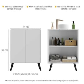 O Gabinete Banheiro 2 Portas Retrô 63cm Multimóveis é produzido em MDP com acabamento acetinado (cerca de 20% de brilho), que garante maior durabilidade, facilidade na limpeza, além de um acabamento superior. Com 2 portas, possui um excelente espaço interno para organizar itens de higiene, toalhas e demais objetos (a prateleira interna suporta 8 Kg e o tampo 9 Kg). Os pés retrô, em polipropileno, dão um charme especial ao móvel deixando-o com um visual leve e permitindo você compor um ambiente com ar vintage e moderno ao mesmo tempo. Uma ótima opção para deixar seu banheiro bonito, prático e organizado. Não acompanha torneira e cuba.