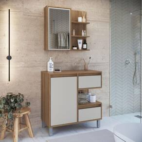 O conjunto para banheiro CJ2001 é produzido em MDP 15mm e acabamento FF fosco. O gabinete possui 1 porta de bater com dobradiça metálica, 1 prateleira interna, 2 gavetas com corrediças metálicas, 4 pés em ABS com altura de 13cm e 1 nicho aberto. Já a espelheira possui 1 porta de bater com espelho 3mm colado, dobradiça metálica, 2 prateleira internas e 2 prateleiras externas. Produto suporta até 45kgs. Conteúdo da embalagem: móvel, ferragens e manual de montagem. A fixação das peças e/ou acessórios é feita por parafusos e cavilhas. Para uma limpeza mais efetiva, utilizar apenas pano macio umedecido e sabão neutro. Não utilizar produtos abrasivos. Garantia de 03 meses contra defeitos de fabricação. Medidas do produto gabinete (AxLxP): 83x80x40cm. Medidas do produto espelheira (AxLxP): 63,5x70,3x14cm. Peso total do produto: 38,11kgs. Não acompanha cuba. Marca: Não Informado