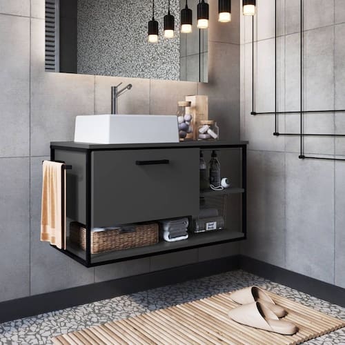 Armário de banheiro para parede com cuba de sobrepor branca e um porta toalhas na lateral para deixar seu ambiente muito mais organizado e espaçoso. Possui uma ampla gaveta e duas prateleiras ideal para guardar toalhas, rolos de papel higiênico e itens de higiene.