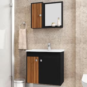 Já o Armário Espelheira conta com uma porta ripada agregando um toque moderno ao ambiente. O espelho oferece praticidade e realça o design sofisticado do banheiro.
