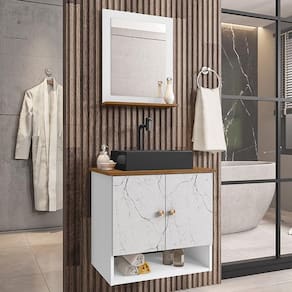 Material da espelheira: MDP de 12 mm no painel e 15 mm na prateleira com espelho de 03 mm de espessura;