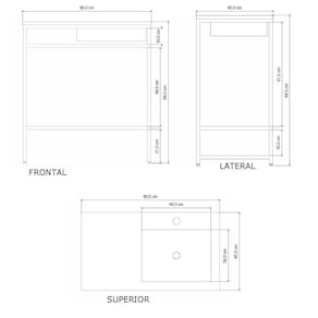 Gabinete preto com estrutura tubular quadrada de 2 cm, com acabamento em PU automotivo que protege contra ferrugem. A base dos pés é em plástico, oferecendo proteção ao piso e maior estabilidade. O tampo e a cuba esculpida são feitos em pedra ardósia Gold, um material natural resistente com acabamento em poliuretano que aumenta a durabilidade e mantém a beleza do produto.