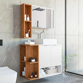 Transforme seu banheiro em um espaço de elegância e funcionalidade com nosso conjunto de gabinete, que inclui uma pia moderna, um espelho sofisticado e prateleiras práticas.