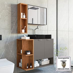 Material da espelheira: MDP de 12 mm no painel e 15 mm na prateleira com espelho de 03 mm de espessura;
