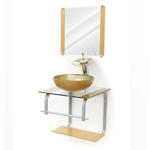 - Bancada de vidro - Cuba de vidro - Prateleira da bancada - Espelho - Válvula - Estrutura em metal e porta toalha - Kit parafusos completo para instalação