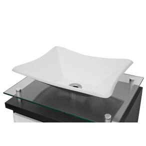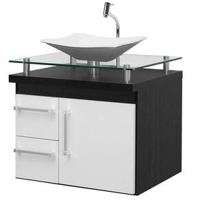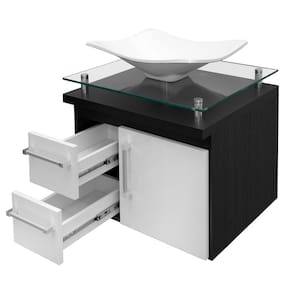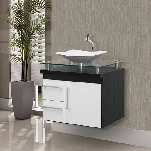 Gabinete - Medida: 555 x 420 x 460mm - Puxadores em aluminio com ponteira em ABS - Cuba em mármore sintético na cor branca - Tampo em MDF com vidro temperado com furos para torneiras e vávula - Corrediças telescópica (250mm) - MDF 15mm pintura UV - Bordas em PVC - Gavetas revestidas em PET, que garantem um perfeito acabamento - Dobradiça com pistão com ângulo de abertura de 110º