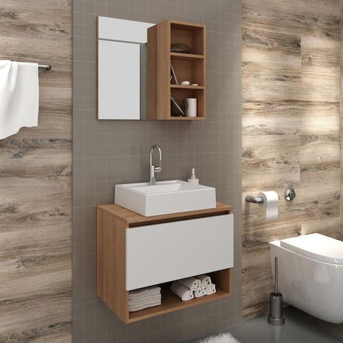 Dimensões do produto montado: Espelheira - Altura: 54cm | Largura: 60cm | Profundidade: 15,6cm Gabinete - Altura: 46,5cm | Largura: 60cm | Profundidade: 38,7cm Cuba - Altura: 11,5cm | Largura: 35cm | Profundidade: 34cm *Você pode consultar as medidas detalhadas na imagem técnica do produto.