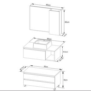 Dimensões do produto montado: Espelheira - Altura: 60cm | Largura: 80cm | Profundidade: 17cm Gabinete - Altura: 26,5cm | Largura: 80cm | Profundidade: 38,7cm Balcão - Altura: 38cm | Largura: 80cm | Profundidade: 38,7cm Cuba - Altura: 11,5cm | Largura: 35cm | Profundidade: 34cm *Você pode consultar as medidas detalhadas na imagem técnica do produto.