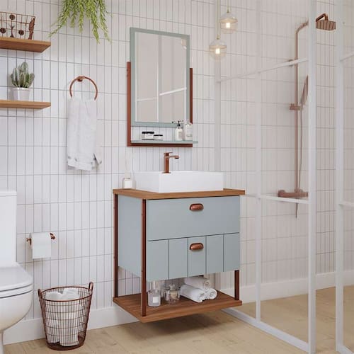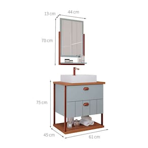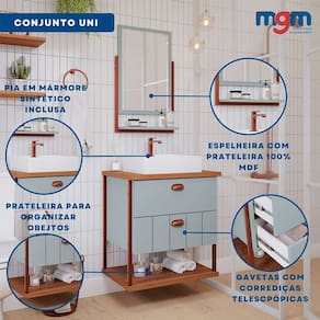 que tal o conjunto de banheiro uni? transforme seu banheiro com o conjunto uni, que inclui gabinete e espelheira, peças perfeitas para otimizar e embelezar o ambiente. com estrutura em mdf e metalon, elas têm ótima resistência para o uso diário, enquanto também oferecem bom espaço de armazenamento, graças às 2 gavetas presentes no gabinete. completo para o dia a dia, o kit acompanha cuba de mármore sintético, que traz um toque de sofisticação ao ambiente e ainda facilita o processo de limpeza no dia a dia. destacando as cores atemporais e os puxadores concha, as peças deixarão seu banheiro mais bonito e elegante, como você sempre sonhou. Marca: Modern