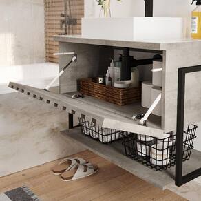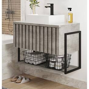Produto: Gabinete de Banheiro Frise com Cuba 80cm Cimento - MGM Cor: Cimento Fabricante: MGM Peso: 29,700 Altura (cm): 69,7 Largura (cm): 84,3 Profundidade (cm): 45,1 Linha: 100 % MDF Marca: Revestimento BP Modelo: 3 Estrutura: Não Acabamento: 1 Garantia: N/T Necessita Montagem ?: N/T Quantidade de Portas: 1 Quantidade de Gavetas Externas: N/T Quantidade de Gavetas Internas: Sim Quantidade de Prateleiras: N/T Possui Toalheiro ?: 1 porta com Pistão a Gás: ABS Quantidade de Puxadores: Metálicas Material do Puxador: N/T Corrediças: Não Dobradiças: N/T Possui Vidro: N/T Acompanha Pia: Sim Material da Pia: Mármore Sintético Dimensões da Pia: 10,2 x 39,7 x 37,5
