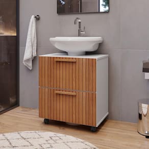 Gabinete de Banheiro Prime Armário Para Pia De Coluna Branco Ripado O Armário de Banheiro Coluna Prime combina funcionalidade e estilo. Suas portas basculantes garantem fácil acesso aos seus itens, enquanto as rodinhas facilitam a movimentação para limpeza. Os puxadores em madeira adicionam um toque de elegância ao seu ambiente. Organize seu banheiro com praticidade e sofisticação.