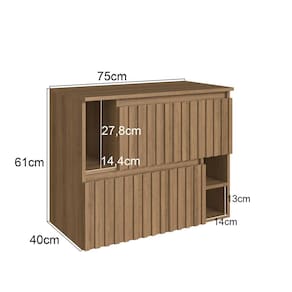- Cor: Marrom - Dimensões montado (AxLxP): 61 x 75 x 40 cm - Material: MDP 15 mm com acabamento fosco - Capacidade total de peso: até 30 kg - Portas: 2 basculantes com pistão a gás (sem puxadores) - Nichos abertos: 3 - Prateleiras internas: 1 (espessura: 1,5 cm | suporta até 1 kg) - Tampo incluso: Sim (75 x 40 cm | espessura 1,5 cm) - Fixação na parede: Sim, necessária - Limpeza recomendada: Pano levemente umedecido com água.