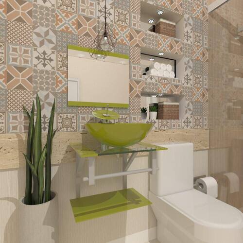 Espessuras: - Bancada de Vidro: 8 mm - Cuba de Vidro: 10 mm - Prateleira Bancada: 6 mm - Espelheira: 4 mm