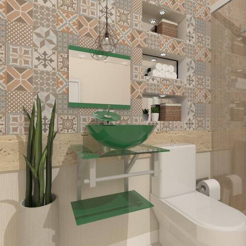 Dimensões: - Bancada de Vidro: 45 x 45 cm largura x profundidade - Cuba de Vidro: 35 cm diâmetro - Prateleira Bancada: 45 x 25 cm largura x profundidade - Espelheira: 45 x 45 cm largura x altura - Porta Toalha: 45 cm largura - Válvula