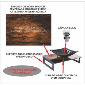 Gabinete De Vidro 50cm Com Cuba Quadrada - Madeira Rustica Os nossos gabinetes são indicados para projetos arrojados e de muito bom gosto, além de valorizar o seu ambiente com Sofisticação em uma decoração de alto padrão, ele consegue usufruir das vantagens que o vidro proporciona e gerar uma durabilidade Indiscutível, sem contar que com as várias opções de cores, você sempre poderá encontrar uma cor perfeita para o seu banheiro. Dados técnicos Itens inclusos: gabinete de vidro 50cm para banheiro é composto de bancada de vidro texturizada, cuba de vidro quadrada, válvula, Estrutura em aço eletrostático preto e kit parafusos completo para instalação. Dimensões: - bancada de vidro: 50cm x 35cm largura x profundidade - cuba de vidro quadrada: 31cm - válvula: 1 1/4 Espessuras: - bancada de vidro temperado: 8mm - cuba de vidro: 10mm : 12 meses conforme política de troca e devoluções . Atenção: preço referente somente ao gabinete, não acompanha torneira, sifão, espelho, prateleira e acessórios. Montagem: montagem e instalação não inclusa na venda ou preço do produto, elas são de inteira responsabilidade do cliente. Imagens ilustrativas.