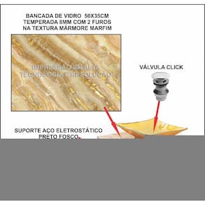 Gabinete De Vidro 50cm Com Cuba Quadrada - Mármore Marfim Os nossos gabinetes são indicados para projetos arrojados e de muito bom gosto, além de valorizar o seu ambiente com Sofisticação em uma decoração de alto padrão, ele consegue usufruir das vantagens que o vidro proporciona e gerar uma durabilidade Indiscutível, sem contar que com as várias opções de cores, você sempre poderá encontrar uma cor perfeita para o seu banheiro. Dados tecnícosItens inclusos: gabinete de vidro 50cm para banheiro é composto de bancada de vidro texturizada, cuba de vidro quadrada, válvula, Estrutura em aço eletrostático preto e kit parafusos completo para instalação. Dimensões: - bancada de vidro: 50cm x 35cm largura x profundidade - cuba de vidro quadrada: 31cm - válvula: 1 1/4 Espessuras: - bancada de vidro temperado: 8mm - cuba de vidro: 10mm Garantia: 12 meses conforme política de troca e devoluções . Atenção: preço referente somente ao gabinete, não acompanha torneira, sifão, espelho, prateleira e acessórios. Montagem: montagem e instalação não inclusa na venda ou preço do produto, elas são de inteira responsabilidade do cliente. Imagens ilustrativas.