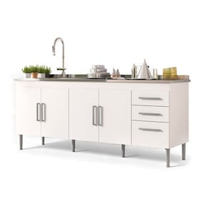 Este gabinete é produzido especialmente para pias de 2,0m, possui 3 gavetas com corrediças metalicas para melhor armazenar os itens de cozinha e conta com uma prateleira profunda completa no seu interior. Possui puxadores modernos e 6 pés para evitar empenamento da base, o gabinete é totalmente fabricado em Mdp de 12mm, aumentando a durabilidade, resistencia e qualidade do produto. O gabinete Nao acompanha o tampo da imagem. Além desses detalhes possui uma facil montagem.