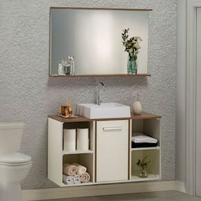 Transforme seu banheiro em um ambiente de revista com o Inspira Design 100! Ideal para espaços maiores, este conjunto de sobrepor combina um balcão amplo e cheio de estilo (60cm altura x 100cm largura x 40cm profundidade) com um armário espelhado sofisticado (65cm altura x 100cm largura x 10cm profundidade). É a união perfeita de design impactante e funcionalidade para quem não abre mão da beleza. Acabamento da Cuba: Alto Brilho Acabamento da Porta: BP Acabamento da Prateleira: BP Acompanha Cuba: Sim Acompanha Manual de Instalação: Não Acompanha Parafusos Para Fixação Na Parede: Sim Acompanha Válvula: Não Ambiente Principal: Banheiro codigo_ean: 7900288254504 Comprimento da Prateleira: 100 cm Cor: Bronze/Branco Cor da Cuba: Branco Cor do Produto: Bronze/Branco Escala de Brilho: Acetinado Escala de Brilho da Porta: Semi-Fosco Escala de Brilho da Prateleira: Semi-Fosco Espessura da Prateleira: 1,5 cm Formato da Cuba: Quadrado Furação para Cuba e Torneira: Não Itens Inclusos: 1 Balcão, 1 Espelheira e 1 Cuba Linha ou Coleção: Arte Manual de Especificação Técnica: https://product-hub-prd.madeiramadeira.com.br/984635021/documents/7c25ba83-9101-4407-bc6d-1fdee06c6d683250176666417592489463768.pdf Manual de Montagem e Instalação: https://product-hub-prd.madeiramadeira.com.br/984635021/documents/b5a56f4a-296a-4d48-b28f-61f783aaf3433250378666417592518724693.pdf Marca: Eco Móveis Material da Cuba: Mármore Sintético Material da Porta: MDP Material da Prateleira: MDP Material do Tampo: MDP Material Principal: MDP Medida da Cuba (C x L x P): 10 x 40 x 38 Necessita Montagem: Não Origem do Produto: Nacional Peso: 42,4 kg Peso Máximo por Prateleira: 30 kg Possui Espelhos: Sim Possui Nichos: Não Possui Pés: Suspenso Possui Portas: Sim Possui Prateleiras: Sim Possui Recorte No Tampo Para Cuba: Não Possui Recorte No Tampo Para Misturador: Não Possui Sifão: Não Possui Tampo: Sim Produto Montado: Não Recomendações de Uso, Manutenção e Limpeza: Limpar com pano úmido ou com alcool Resistente à Chuva: Não Sapatas Niveladoras: Não Suporta Até (kg): 50 kg Tipo de Cuba: Apoio Tipo de Dobradiça/Corrediça da Porta: Metálica Tipo de Gabinete: Gabinete Suspenso Tipo de Móvel para o Banheiro: Gabinete de Banheiro Tipo de Porta: Abrir Tipo de Puxador da Porta: Embutido Válvula indicada: padrão Marca: Não Informado