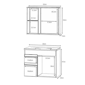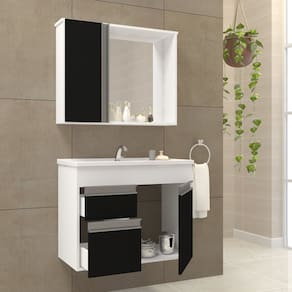Gabinete para Banheiro suspenso , ele é composto pelo gabinete pia e espelheira , o gabinete possui uma porta, duas gavetas com corrediças telescópicas e um bom espaço interno tanto nas gavetas como no gabinete, e a espelheira contém um porta com uma prateleira de vidro para guardar pequenos produtos do dia a dia . Acabamento da Gaveta: Fosco Acabamento da Porta: Pintura UV Acabamento da Prateleira: Pintura UV Acompanha Cuba: Sim Acompanha Gaveteiro: Sim Acompanha Manual de Instalação: Sim Acompanha Parafusos Para Fixação Na Parede: Sim Acompanha Tampo: Não Acompanha Válvula: Não Altura do Espelho: 46,2 cm Ambiente Principal: Banheiro codigo_ean: 7900288254467 Complexidade da Montagem: Baixa: pode ser montado por uma pessoa sozinha Comprimento da Prateleira: 23 cm Cor: Branco/Preto Cor da Cuba: Branco Cor da Gaveta: Preto Cor da Porta: Preto Cor do Produto: Branco/Preto Cor Interna: Branco Escala de Brilho: Brilhante Escala de Brilho da Gaveta: Fosco Escala de Brilho da Porta: Fosco Escala de Brilho da Prateleira: Fosco Espessura do Espelho: 3 mm Formato da Cuba: Retangular Formato do Espelho: Retangular Formato Espelheira: Retangular Furação para Cuba e Torneira: Sim Gaveta com Chave: Não Itens Inclusos: 1 Espelheira, 1 Cuba, 1 Gabinete, Kit Ferragens e Manual de Montagem Largura do Espelho: 37,8 cm Linha ou Coleção: Napoli Manual de Montagem e Instalação: https://product-hub-prd.madeiramadeira.com.br/122300202/documents/5875810a-1520-47c9-8e74-4e122bb9e00b3208389664217580486632148.pdf Marca: Arte Gabinetes Material da Cuba: Resina Material da Gaveta: MDF Material da Porta: MDF/MDP Material da Prateleira: MDF/MDP Material Principal: MDF/MDP Medida da Cuba (C x L x P): 62,5x31x10 Medida da Espelheira (A x L x P): 49x63x13 Medida do Gabinete (A x L x P): 47x60x29 Necessita Montagem: Sim Origem do Produto: Nacional Peso: 22 kg Peso Máximo por Gaveta: 2,5 kg Peso Máximo por Prateleira: 1,5 kg Possui Espelheira: Sim Possui Gabinete: Sim Possui iluminação: Não Possui Nichos: Não Possui Pés: Não Possui Porta de Vidro: Não Possui Recorte No Tampo Para Cuba: Sim Possui Recorte No Tampo Para Misturador: Não Possui Rodízio: Não Possui Sifão: Não Possui Tampo: Não Produto Montado: Sim Quantidade de Espelhos: 01 Recomendações de Uso, Manutenção e Limpeza: Limpador Multiuso, Lustra móveis Sistema de Montagem: Parafusos e Cavilhas Suporta Até (kg): 2,5 kg Suporte para Toalheiro: Não Tamanho do Espelho (A x L): 46,2x37,8 Tamanho do Gabinete: Médio: de 60cm a 80cm de largura Tamanho do Produto: 47x60x29,6 Tipo de Corrediça da Gaveta: Metálica Telescópica Tipo de Cuba: Embutir Tipo de Dobradiça/Corrediça da Porta: Metálica Tipo de Fixação do Espelho: Molduras Tipo de Gabinete: Gabinete Suspenso Tipo de Gaveta: Externa Tipo de Porta: Articulada Tipo de Puxador da Gaveta: Embutido Tipo de Puxador da Porta: Cava Marca: Não Informado