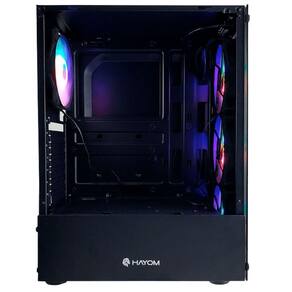 Gabinete Gamer Hayom Gb1749, Atx, Usb 3.0, 4x Fans Rgb, Lateral E Frontal Em Vidro - Preto DESCRIÇÃO GERAL: O GABINETE GAMER HAYOM GB1749 oferece design moderno com painéis em vidro temperado para destacar a iluminação interna do setup. com placas-mãe ATX e Micro-ATX, proporciona excelente organização e fluxo de ar, suportando até 4 fans de 120mm inclusos para resfriamento eficiente. Com espaço interno otimizado para placas de vídeo de até 280mm, instalação de 2 SSDs de 2,5 e 1 HDD de 3,5, e fonte ATX na posição inferior, é a escolha ideal para quem busca estilo, funcionalidade e flexibilidade na montagem de PCs gamers ou de alto desempenho.