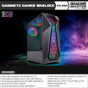 O Gabinete Gamer K-Mex Warlock CG-A1D4 possui um design distinto, com painel frontal preto com grade de ventilação e detalhe em barra LED RGB Rainbow, com iluminação personalizável.