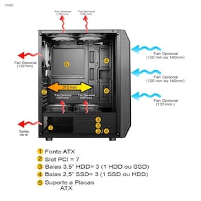 Gabinete gamer pixxo cg05 s/ coolers atx s/ fonte Gabinete gamer pixxo cg05 s/ coolers atx s fonte preto O gabinete gamer pixxo cg05, possui um filtro magnético anti-poeira na parte superior, a lateral possui uma lateral acrílica, o gabinete suporta placa mãe atx e o slot da fonte fica localizado na parte inferior do gabinete. Áudio frontal Hd áudio Baias para hd 3,5 - 3 1 compartilhada com ssd Baias para ssd / hds 2,5 - 3 1 compartilhada com hd Cor Preto Espessura da chapa 0.5mm spcc Fontes suportadas Atx Medidas do gabinete c x l x a 375 x 215 x 439 mm Pci profile Full profile Peso 3.2kg Placas suportadas Atx Portas usb 2.0 2 Portas usb 3.0 1 Quantidade de coolers suportados Frontal: 3x120mm ou 2x140mm Traseira: 1x120mm Teto: 2x120mm Inferior: 2x120mm Quantidade de slots pci 7 Marca: Não Informado