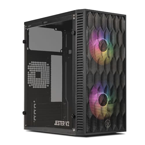 O Gabinete Gamer TGT Jester V2 oferece um design compacto e eficiente para quem busca montar um setup com estilo e bom fluxo de ar. Com formato Mini-Tower, ele é compatível com placas-mãe M-ATX e ITX, sendo ideal para quem precisa de um gabinete prático e de fácil instalação em ambientes com espaço limitado. Seu acabamento na cor preta, combinado com o painel frontal com malha metálica prismática e a lateral em acrílico, proporciona um visual moderno e permite visualizar o interior da máquina.