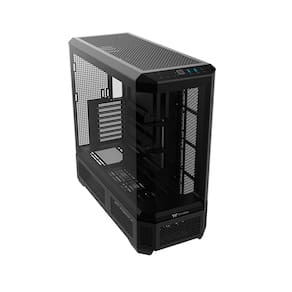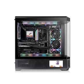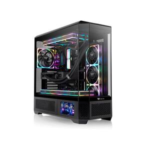 O View 600 TG da Thermaltake é um gabinete Full Tower combina estrutura robusta com visual marcante e sofisticado com seu design na cor preta. Com quatro painéis de vidro temperado de 4 mm, oferece ampla visibilidade dos componentes e acabamento premium. Compatível com placas-mãe E-ATX, incluindo modelos com conectores ocultos da ASUS, MSI e GIGABYTE. Conta com espaço para até dez ventoinhas de 120/140 mm e radiadores de até 420 mm, entregando excelente fluxo de ar. Os slots PCI-E rotativos permitem instalação horizontal ou vertical da GPU (com riser opcional), e o suporte integrado evita o empenamento da placa. Filtros de poeira no topo, base e lateral protegem o sistema, enquanto a estrutura interna acomoda até três HDDs e três SSDs. O painel I/O no topo oferece conexões USB 3.0, USB-C e áudio HD.