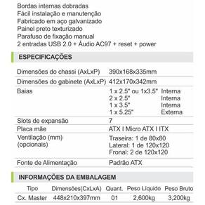 CARACTERÍSTICAS PRINCIPAIS Fabricado em Aço Galvanizado Bordas internas dobradas Fácil instalação e manutenção Peinel preto texturizado Parafuso de fixação manual 2 Entradas USB 2.0 + Áudio AC97 + Reset + Power 07 Slots de expansão Suporte para até 04 coolers de ventilação Ean: 7908347905152